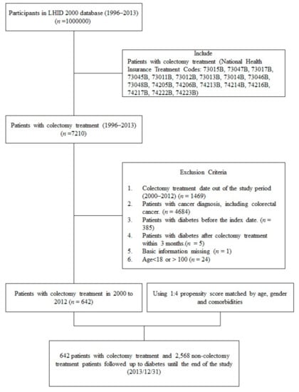 We performed a retrospective cohort study of patients without colorectal cancer to explore the association between colectomy and type 2 diabetes. A flowchart of the study cohort collection is shown in Figure 1. Patients in the LHID 2000 who underwent colectomy (subtotal or total colectomy, right hemicolectomy or transverse colectomy, left hemicolectomy or sigmoid colectomy, proctectomy and partial colectomy) between 2000 and 2012 were selected by the National Health Insurance (NHI) Treatment codes (73045B, 73012B, 73011B, 73013B, 73014B, 73046B, 73048B, 74205B, 74206B, 74223B, 743213B, 74214B, 74216B, 74217B, 74222B, 73015B, 73047B, 73017B) for inclusion in the study. The index date was defined as the date of colectomy. The colectomy procedures and NHI treatment codes were illustrated in Figure 1 and Supplementary Figure S1. We excluded the patients with colorectal cancer by the catastrophic illness certification. The catastrophic illness certifications are reviewed by experts according to pathological report and clinical staging, therefore the diagnosis is more accurate than ICD-9 cm []. The exclusion criteria were (1) colectomy treatment date out of the study period (2000–2012), (2) the presence of colorectal cancer, (3) patients with diabetes before the index date, (4) a diagnosis of diabetes mellitus before index date or within 3 months after index date, and (5) age <18 years or >100 years.
