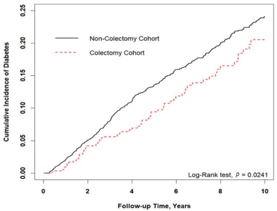 Results of Kaplan–Meier analysis for cumulative incidence of type 2 diabetes. Cumulative incidence of type 2 diabetes was lower in the colectomy cohort than the control cohort (p = 0.024).