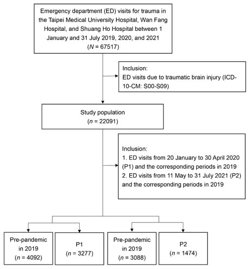 All trauma-related ED visits at participating hospitals during the period associated with small-scale local infection from January 20 to 30 April 2020 (period one, P1) and the period associated with large-scale community spread from 11 May to 31 July 2021 (period two, P2) were included in our study. The treatment efficiencies for TBI in the ED during P1 and P2 were compared with corresponding periods in 2019 (pre-pandemic).