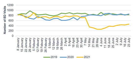 - Choi, D.H.; Jung, J.Y.; Suh, D.; Choi, J.Y.; Lee, S.U.; Choi, Y.J.; Kwak, Y.H.; Kim, D.K. Impact of the COVID-19 outbreak on trends in emergency department utilization in children: A multicenter retrospective observational study in Seoul metropolitan area, Korea. J. Korean Med. Sci. 2021, 36, e44. [Google Scholar] [CrossRef]