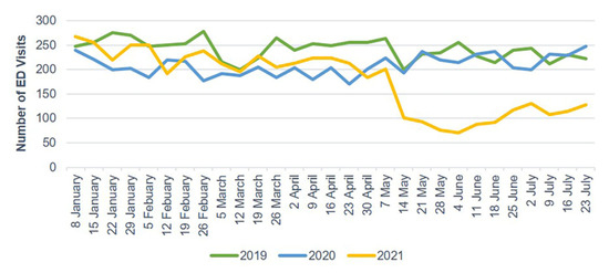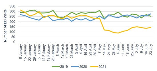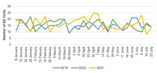 Weekly ED visits due to mild head injury from January to July 2019, 2020, and 2021. ED, emergency department.