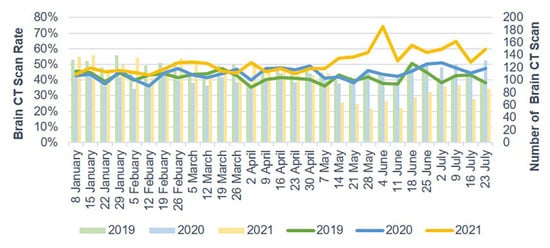 We extracted data for ED visits, brain CT scans, and brain operations from the CRD between 1 January and 31 July 2019, 2020, and 2021. Identifiable information from these hospital data was encrypted to ensure patient confidentiality. The Institutional Review Board of Taipei Medical University approved this study (No.: N202106027).
