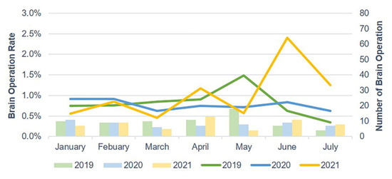 Brain operation rate for TBI in the ED from January to July 2019, 2020, and 2021. ED, emergency department; TBI, traumatic brain injury.