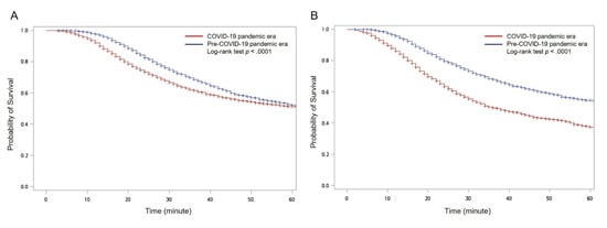 Kaplan–Meier curves with log-rank test for the time from emergency department (ED) arrival to brain computed tomography (CT) for traumatic brain injury (TBI)-related ED visits between the COVID-19 pandemic era and the pre-COVID-19 pandemic era during (A) P1 and (B) P2.
