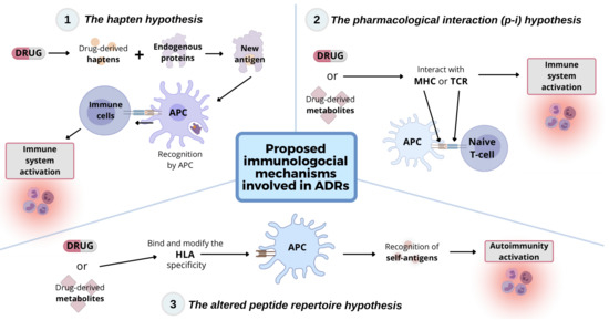 Immune system association in DILI with SCARs: The three main hypotheses regarding the immunological mechanisms involved in ADRs are: (1) The hapten hypothesis, (2) The pharmacological interaction (p-i) hypothesis, and (3) The altered peptide repertoire hypothesis.