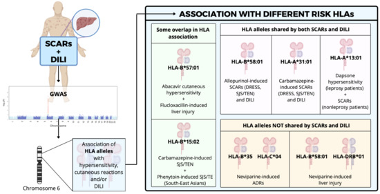 This might partially explain why the disease is so infrequent despite several genome-wide association studies (GWAS) reporting associations between HLA alleles and the predisposition to ADRs related to a number of drugs [78]. The discovery of these associations enlightened the possibility of predicting ADRs through pharmacogenetic screenings [79]. Examples of some of these associations can be observed in Figure 2.