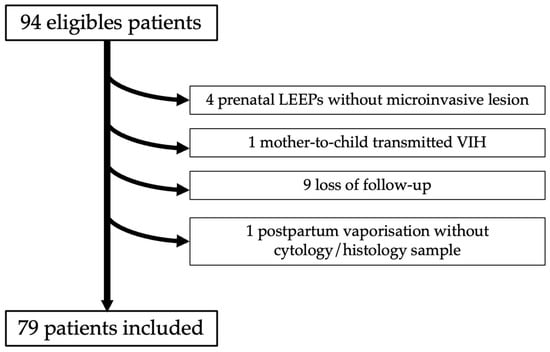 Ninety-four women diagnosed with high-grade dysplasia were identified. Among them, four patients with a cytological HSIL were excluded due to an extensive lesion during the antenatal period with colposcopic neoplasia suspicion, who subsequently underwent a LEEP procedure. Finally, only CIN 2+ lesions without invasive lesions were found in these four cases. No cases received corticosteroid treatment in our cohort; only one patient was known to have mother-to-child HIV infection with CD4+ in the normal range throughout her pregnancy. After exclusion of 15 patients, 79 patients fulfilled the inclusion criteria and were analyzed (Figure 1). The characteristics of the study population are presented in Table 1 and Table 2.