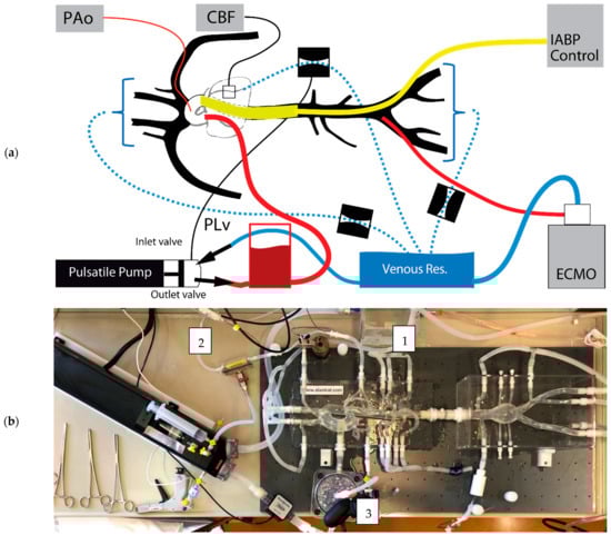 In vitro mock-circuit setup: schematic (a) and real (b). Measurements were made at the coronary level with a flowmeter (CBF) and in the central aorta with a pressure sensor (PAo). (1) Hemodynamic resistances were fixed with Hoffmann clamps. (2) Systolo-diastolic varying resistance synchronized to pump pulsatility, simulating the effect of left ventricular contraction (PLv). (3) Compliance reservoir. ECMO drained liquid from the venous tank and injected it into the femoral artery.