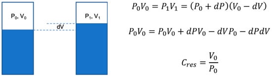 Compliance reservoir schematic in two different conditions to derive the equations. To obtain physiological pulse pressure (PP) at the aortic level, (V0) was adjusted. The added compliance (Cres) was 1.03 mL/mmHg at HR of 60/min and 0.31 mL/mmHg at HR of 100 bpm.
