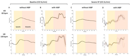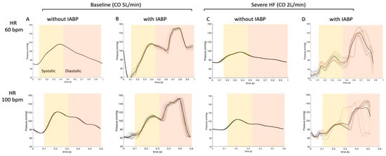 Average of pressure waveforms at the ascending aorta level for a heart rate of 60 bpm (top) and a heart rate of 100 bpm (bottom). Baseline conditions (CO of 5 L/min) with and without IABP enabled are presented in columns (A) and (B), respectively. Severe HF scenarios (CO of 2 L/min) with and without IABP enabled are presented in (C,D). The waveforms (thin lines) are recorded on 8–10 consecutive cardiac cycles and averaged (thick lines).