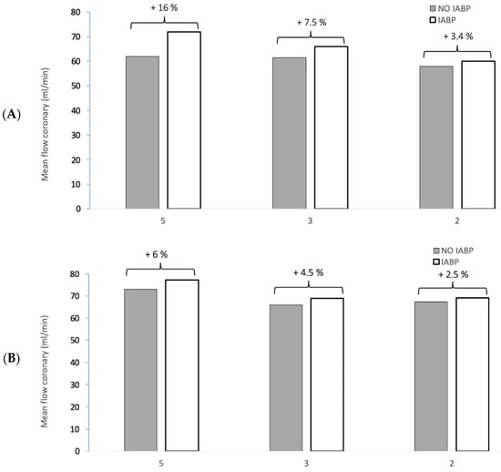 Coronary mean flow in different clinical scenarios: (A) (HR 60 bpm) and (B) (HR 100 bpm). The different clinical scenarios highlight the impact of IABP at different CO. The first situation corresponds to a baseline condition with a cardiac output of 5 L/min without ECMO support. Low CO syndrome by gradually decreasing CO to 2 L/min compensated to a total of 5 L/min with ECMO.
