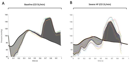 Pressure waveforms at the ascending aorta level at the baseline condition (CO 5 L/min) (A) and in the severe LV failure condition (CO 2 L/min) (B) are presented for a heart rate of 60 bpm (continuous lines). The effect of enabling the IABP on the pressure waveforms is superposed (dashed line) and is highlighted by the area under the curves (AUC) emphasizing the pressure decrease during systolic and the increase during diastolic compared to the pressure waveform without enabling the IABP.
