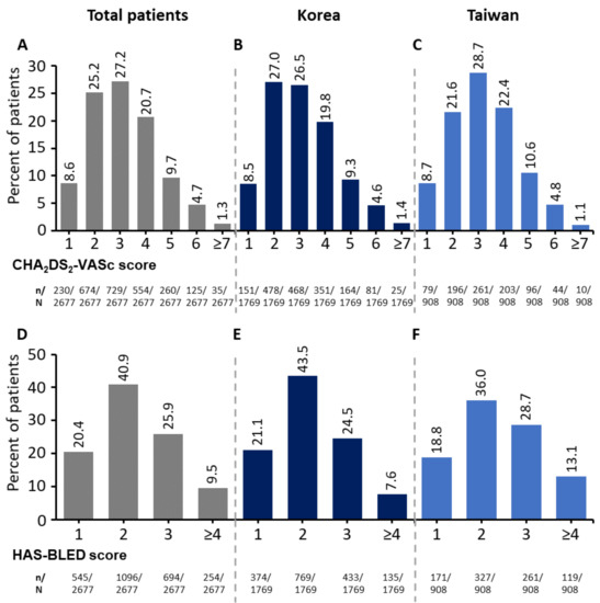 Distribution of CHA2DS2-VASc and HAS-BLED Scores. Distribution of CHA2DS2-VASc (A–C) and HAS-BLED (D–F) scores for total patients (A,D), patients from Korea (B,E) and patients from Taiwan (C,F). A total of 70 patients (2.6%) had a CHA2DS2-VASc score of 0; 88 patients (3.3%) had a HAS-BLED score of 0. CHA2DS2-VASc, congestive heart failure, hypertension, age, diabetes, prior stroke/TIA, vascular disease, and sex category; HAS-BLED, hypertension, abnormal renal and liver function, stroke, bleeding history or disposition, Labile INR, elderly, drugs or alcohol; INR, international normalized ratio; TIA, transient ischemic attack.