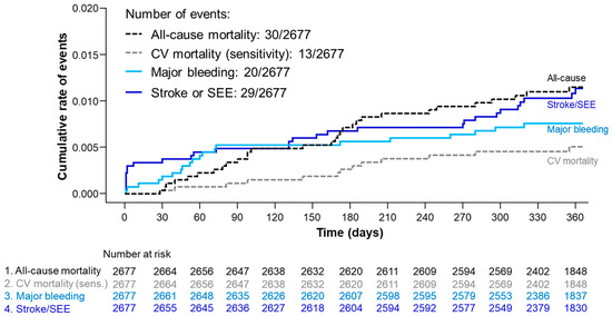 Clinically relevant events assessed included first or recurrent ischemic stroke, hemorrhagic stroke, SEE, bleeding, transient ischemic attack (TIA), MI, acute coronary syndrome, all-cause death, and cardiovascular (CV)-related death. Bleeding was characterized as major, clinically relevant non-major (CRNM), or minor in accordance with the International Society on Thrombosis and Haemostasis [15].