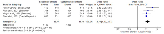 - Riad, A.; Pokorná, A.; Attia, S.; Klugarová, J.; Koščík, M.; Klugar, M. Prevalence of COVID-19 Vaccine Side Effects among Healthcare Workers in the Czech Republic. J. Clin. Med. 2021, 10, 1428. [Google Scholar] [CrossRef] [PubMed]