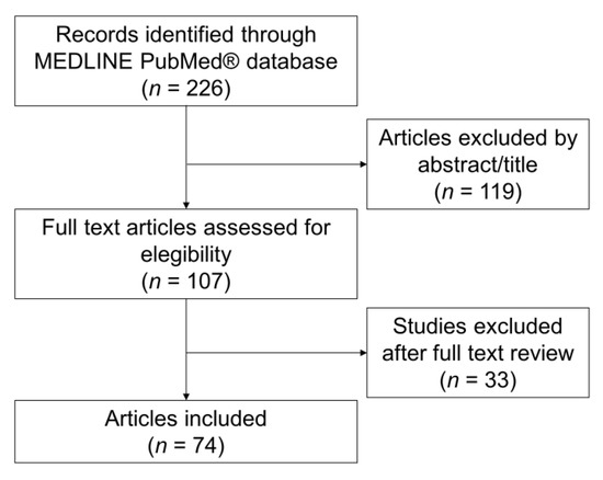 A total of 226 articles were identified through PubMed Medline®. After screening through the titles and abstracts, 151 articles were excluded because they were not pertinent. A total of 107 articles underwent full-text assessments for eligibility, and 33 articles were excluded based on the exclusion/inclusion criteria. Finally, a total of 74 studies were included in the review (Figure 1).