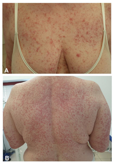 Itchy confluent erythematous maculopapular eruption involving the upper trunk and limbs in a bilateral and symmetrical fashion and typical craniocaudal progression developed five days after the mRNA-1273 vaccine on a 54-year-old woman (A,B).