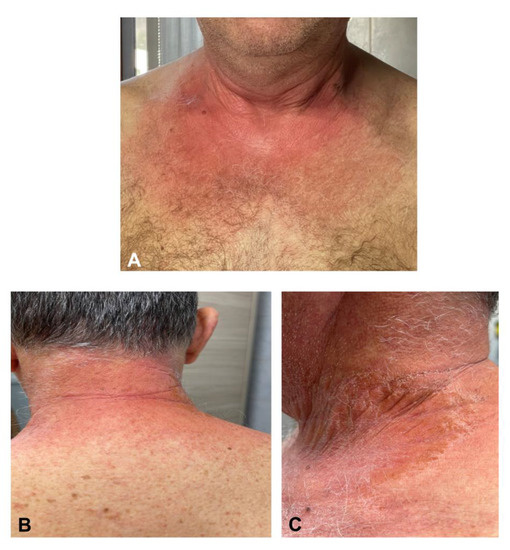 Erythematous and sharply demarcated lesions with symmetric and intertriginous-flexural distribution involving the neck and the gluteal area (symmetrical drug-related intertriginous and flexural exanthema—SDRIFE) developed on a 65-year-old physician two weeks after the BNT162b2 vaccine (A–C).