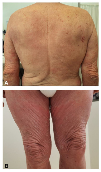 Diffuse bilateral eczematous lesions with overlying excoriation of the back, arms, and legs on a patient without a history of atopic dermatitis following the AZD1222 vaccine (71-year-old man) (A,B).