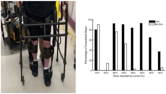 After epidural stimulator implantation along the spinal segments T12–S2, the participant underwent 12 weeks of exoskeletal-assisted walking with the first two weeks having 100% support with stepping []. The third week, the participant was transitioned to Canadian crutches from a walker. During weeks four through eight, swing phase assistance was gradually decreased depending on the participant’s performance. By week ten, the stepping or swing phase assistance had been decreased to 35% while the participant walked for at least 45 min per session. As the assistance level was decreased from 45% to 35% during the last weeks of the training, the number of unassisted steps also increased. Overall, through the 12 weeks of training (24 sessions), the participant decreased exoskeletal assistance from 100% to 35% and improved in temporal and rhythmic patterns as determined by electromyogram testing and gait speed [].