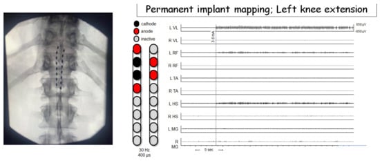 - Calvert, J.S.; Grahn, P.J.; Strommen, J.A.; Lavrov, I.A.; Beck, L.A.; Gill, M.L.; Linde, M.B.; Brown, D.A.; Van Straaten, M.G.; Veith, D.D. Electrophysiological guidance of epidural electrode array implantation over the human lumbosacral spinal cord to enable motor function after chronic paralysis. J. Neurotrauma 2019, 36, 1451–1460. [Google Scholar] [CrossRef] [PubMed]