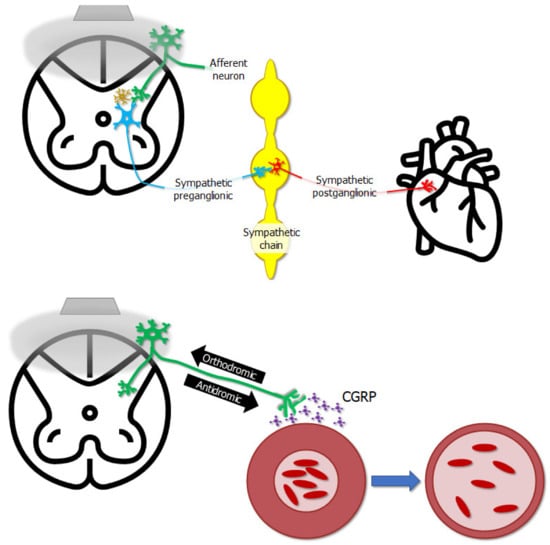 - Croom, J.E.; Foreman, R.D.; Chandler, M.J.; Barron, K.W. Cutaneous vasodilation during dorsal column stimulation is mediated by dorsal roots and CGRP. Am. J. Physiol.-Heart Circ. Physiol. 1997, 272, H950–H957. [Google Scholar] [CrossRef]