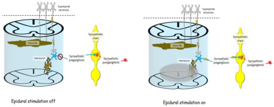Figure 5 shows a visual model of an injured spinal cord and sympathetic structures influencing cardiovascular function without and with epidural stimulation, respectively. After SCI, brainstem neurons which help regulate cardiovascular control may be cut off from their target neural circuits in the spinal cord. While many clinically complete injuries are not anatomically complete [], even if descending signals can get past the injury, they may be too weak to exert any influence on surviving sympathetic preganglionic neurons. If those neurons are inactive, they will not influence the sympathetic chain, and sympathetic postganglionic neuron exertion to cardiovascular organs will be reduced, thereby giving rise to cardiovascular dysregulation. However, when epidural stimulation is delivered to the lumbar spinal cord below the injury it can act through dorsal root afferents to influence interneurons in the spinal cord which can span multiple spinal segments, subsequently exerting influence on sympathetic preganglionic neurons [,]. Once brought into a more excitable state, sympathetic preganglionic neurons are then enabled to influence the postganglionic neurons originating in the sympathetic chain, thereby influencing cardiovascular function in ways that have been beneficial to persons with SCI.