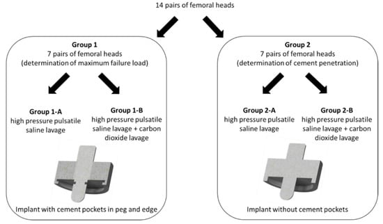 The paired heads were divided into Group 1 (determination of the maximum failure load) and Group 2 (determination of cement penetration). This resulted in Group 1-A and Group 1-B to determine the maximum failure load and in Group 2-A and 2-B to determine the cement penetration of the different cancellous bone cleaning techniques, as described in the following section (Figure 1).