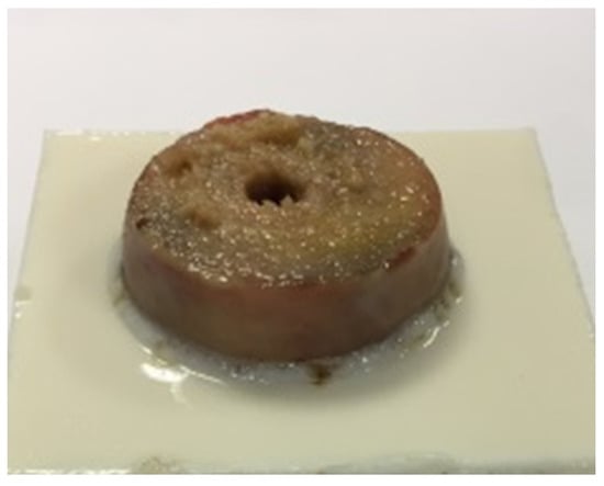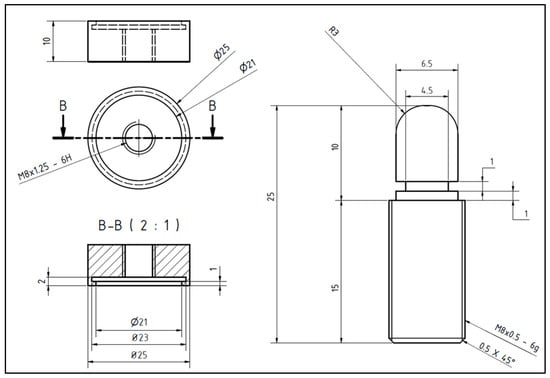 The specimens were casted in a mold using synthetic resin (Rencast FC 53, Huntsman Advanced Materials GmbH, Bergkamen, Germany) in order to be able to integrate them into the testing setup. All femoral heads were trimmed slightly above the equator to remove the fovea capitis femoris and to preserve the maximum volume of cancellous bone (Figure 2). In the right–left comparison, the identical resection heights were selected. By measuring the sliced fragments, the adherence to the resection heights was checked again. Since the cement–bone interface was investigated in this experimental study, we manufactured aluminum test implants as part of the test standardization following the peg design of the femoral component in TKA (Figure 3). In addition, a central hole for the peg with a diameter of 9 mm and a depth of 9 mm was drilled in the center of the fixed and resected femoral head (Figure 2). The hole diameter in relation to the peg diameter was chosen to allow a homogeneous cement mantle and to avoid a press fit.