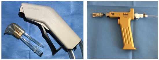 - Kalteis, T.; Pforringer, D.; Herold, T.; Handel, M.; Renkawitz, T.; Plitz, W. An experimental comparison of different devices for pulsatile high-pressure lavage and their relevance to cement intrusion into cancellous bone. Arch. Orthop. Trauma Surg. 2007, 127, 873–877. [Google Scholar] [CrossRef] [PubMed]