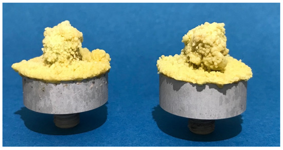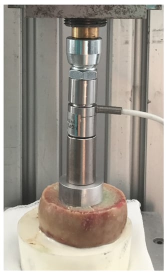In accordance with ISO 5833, the maximum load to failure of the bone–cement interface was determined 24 ± 2 h after cementation using a pull-out test. The specimens were stored in a refrigerator at +4 °C and kept at room temperature for 2 h before the start of the experiment. The test was performed for Group 1-A and 1-B using a material testing machine (Zwick Roell, Z005, Ulm, Germany) under displacement control. The implant was pulled out at a traverse speed of 2 mm/min. The resulting force was recorded, and the maximum force values were defined as failure load (Figure 6).