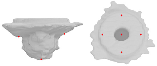 For analyzing cement penetration, we used an implant design without undercuts (Figure 1, bottom right). In addition, we coated the Group 2-A and 2-B implants with a wax-based release agent spray (goessl pfaff®, Karlskron, Germany). This enabled us to remove the implant after complete hardening of the bone cement without causing defects to the cement mantle. Subsequently, we obtained CT images (SOMATOM Emotion, Siemens Healthcare GmbH, Erlangen, Germany) of all 14 femoral heads of Group 2-A and 2-B with a slice thickness of 0.75 mm without metal artifacts. In the first step, the cement was segmented from the CT scans using the ITK-SNAP software [40]. Then, the cement volume and cement penetration were analyzed with the Geomagic Studio Program (Raindrop Geomagic, NC, USA). In addition, with regard to cement penetration depth, four different points in the plane and two further points under the peg were measured. Only the cement that penetrated the bone was analyzed (Figure 7). The cement outside the test implants and on top of the surface was not included in the calculation as it did not penetrate the cancellous structure.