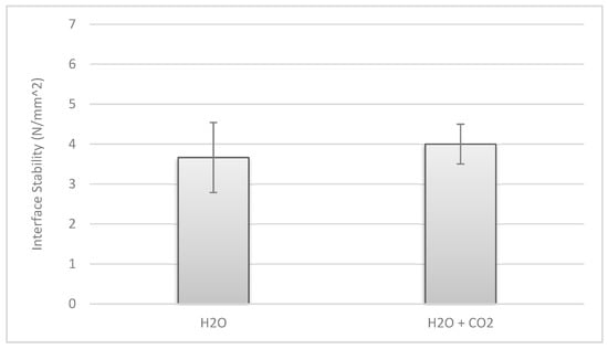 The t-test revealed no statistically significant difference for the additional use of a carbon dioxide lavage prior to cement application. The needed force to pull off the implant was 3.7 ± 0.9 N/mm2 in Group 1-A (saline lavage only) and 4.0 ± 0.5 N/mm2 in Group 1-B (saline lavage + carbon dioxide lavage). This difference of 0.3 N/mm2 showed no significance −t(6) = −1.029, p = 0.343 (95% CI [−1.206, 0.492]) (Figure 8).