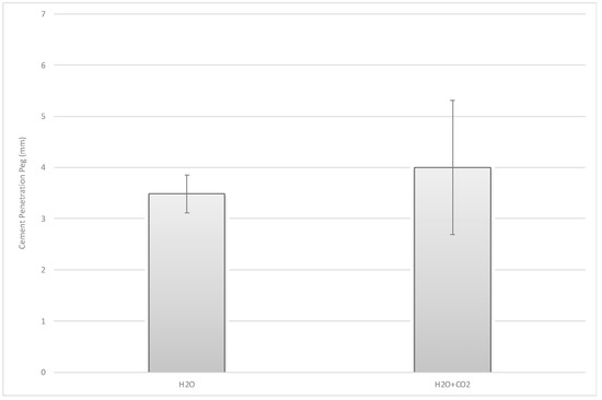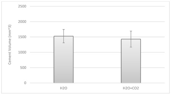 The t-test also revealed no statistically significant difference for the additional use of a carbon dioxide lavage prior to cement application in terms of cement penetration. In Group 2-A, in which only a saline high-pressure lavage was used, the mean cement volume that penetrated into the cancellous bone was 1526.5 ± 217 mm3 according to the 3D analysis via itk-Snap [40]. In Group 2-B, where an additional carbon dioxide lavage was used, the mean cement volume was 1431.1 ± 963 mm3. The difference of 95.4 mm3 was not significant −t(6) = 1.815, p = 0.119 (95% CI [−33.19, 223.94]) (Figure 9).