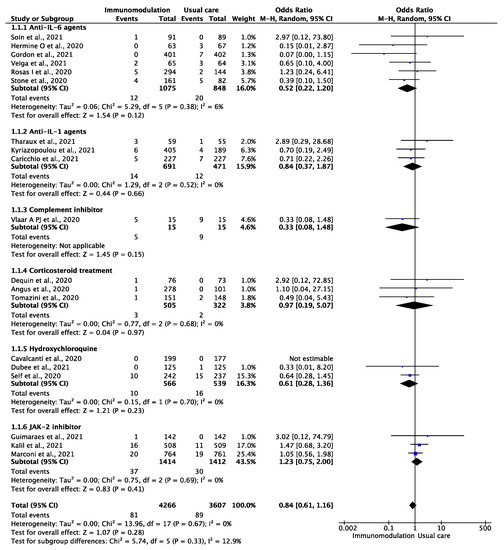 Among 8499 patients hospitalized with COVID-19, 4635 were treated with an immunomodulatory agent as an add-on to usual care, and 3,861 were treated with usual care only. The median (IQR) follow-up period of the included studies was 28 (21–28) days.