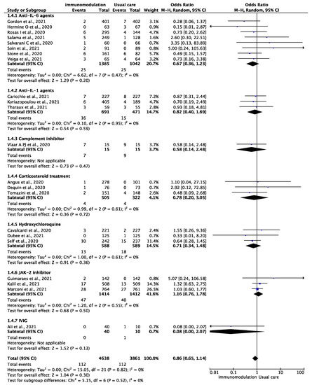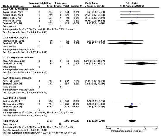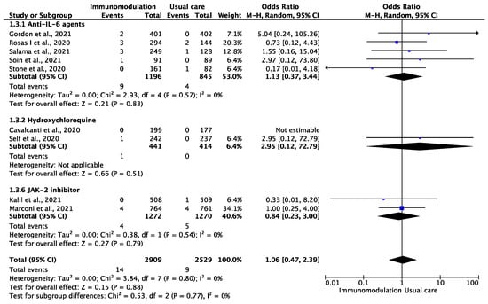 Odds ratio (OR) and 95% confidence intervals for the occurrence of venous thromboembolic events among the hospitalized COVID-19 patients prescribed immunomodulatory agents as an add-on to usual care vs. usual care only. Boxes represent the OR and lines represent the 95% CIs for individual studies. The diamonds and their width represent the pooled ORs and the 95% CIs, respectively. CI, confidence interval for the Mantel–Hansen estimator, I2: heterogeneity.
