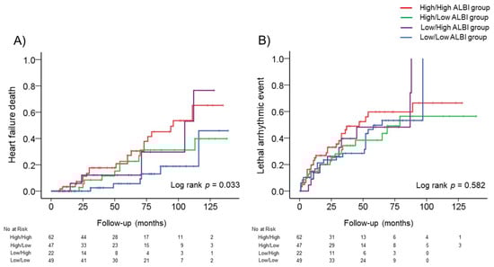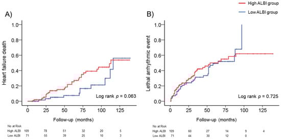 The incidence of adverse events (heart failure death or lethal arrhythmic event) in the High and Low ALBI groups. (A) The cumulative incidence curve of heart failure death with a log rank test between the High and Low ALBI groups. (B) The cumulative incidence curve of lethal arrhythmic events with a log rank test between the High and Low ALBI groups.