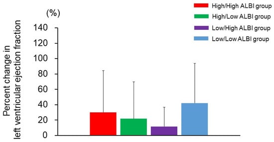 In the present study, 109 (60.5%) and 84 (46.6%) of the patients had high ALBI scores before and after CRT, respectively. The patients (n = 180) were recategorized into four groups based on their ALBI scores before and 6 months after CRT: High/High (n = 62), High/Low (n = 47), Low/High (n = 22) and Low/Low (n = 49). The percentage change in LVEF from baseline to 6 months after CRT was calculated as an assessment of LV systolic function, and it was not different among the four groups (Figure 2).