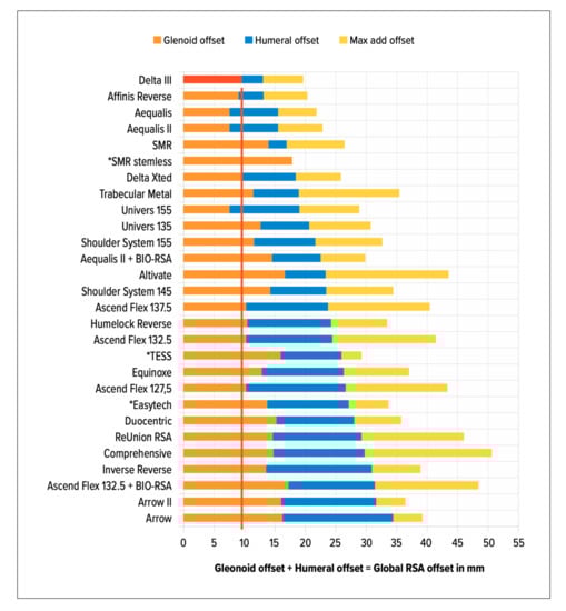 Whether lateralization of reverse arthroplasty is undertaken on the glenoid or at the humerus has different effects. Werthel et al. studied 28 reverse shoulder implant combinations of 22 different prostheses on the market currently []. Grammont’s Delta III prosthesis was used as the baseline reference with 13.1 mm lateralization (global). There was a large variability for global lateralization (global = glenoid + humeral) with a range from 13.1 to 35.8 mm for current prostheses. Global lateralization values were subdivided into the humeral and glenoid contribution. Figure 3 summarizes the breakdown of lateralization for different implants on the market according to Werthel’s article [].