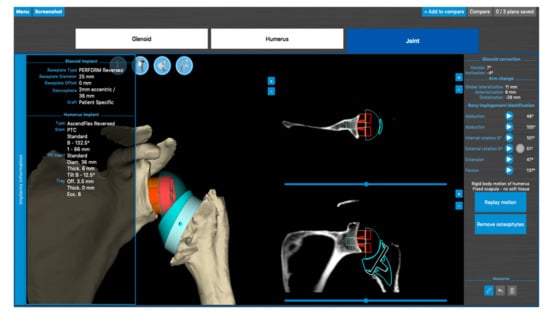 The lead author (SB) has developed a technique of patient-specific lateralization, influenced by the literature and discussion with the other authors []. All shoulder arthroplasties are planned with 3D planning software (Figure 8), allowing the dynamic simulation and evaluation of impingement-free, rigid body range of motion.