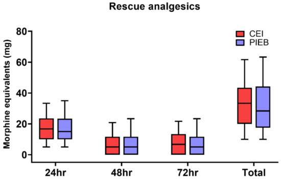 The need for rescue analgesic dose for the first 72 h was calculated separately. There was no significant difference in the rescue opioid consumption administered intravenously in the 72 h postoperative period between the groups (33.3 mg [20.0–43.3] vs. 28.3 mg [18.3–43.3], p = 0.375) (Figure 1). The dose of rescue analgesic was higher in the CEI group than in the PIEB group in the PACU (7.9 mg [3.3–10.0] vs. 5.0 mg [0.0–8.3], p = 0.015). However, there were no differences in the dose of rescue analgesic between the two groups in the first 24 h (CEI: 16.7 mg [10.0–22.9] vs. PIEB: 15.0 mg [10.0–23.3], p = 0.530), 48 h (5.0 mg [0.0–11.7] vs. 5.0 mg [0.0–11.7], p = 0.939) and 72 h (6.7 mg [0.0–13.3] vs. 5.0 mg [0.0–11.7], p = 0.439) after surgery (Figure 1). Other non-opioid analgesics doses were also not different until 72 h after surgery (p = 0.462).