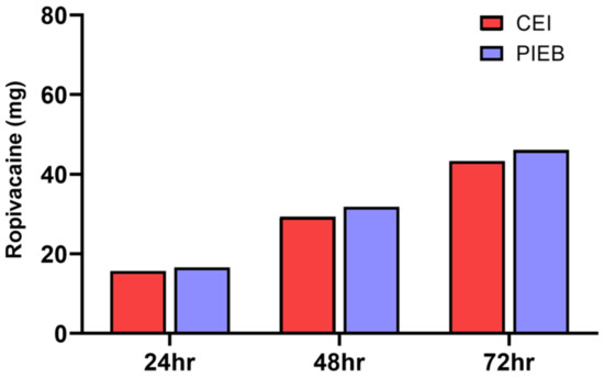 There was no difference in the cumulative local anesthetic consumption between the two groups in 24 h (CEI 15.7 ± 4.6 mg vs. PIEB 16.6 ± 4.1 mg, p = 0.165), 48 h (29.4 ± 8.8 mg vs. 31.8 ± 7.9 mg, p = 0.060) and 72 h (43.4 ± 12.8 mg vs. 46.1 ± 11.4 mg, p = 0.130) after surgery (Figure 2).