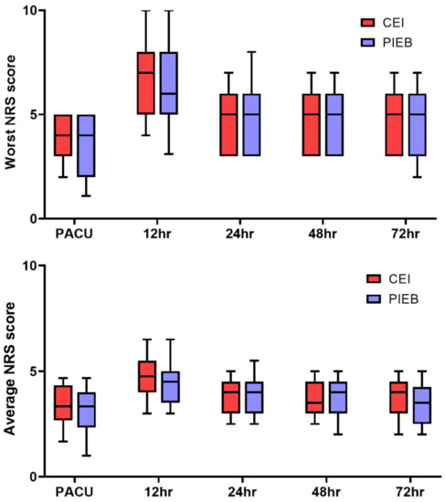 There was also no difference in the sufentanil consumption via epidural infusion between the two groups in 24 h (CEI: 63.8 μg [53.7–77.3] vs. PIEB: 56.1 μg [48.9–81.8], p = 0.289) and 48 h (92.8 μg [79.9–102.6] vs. 91.8 μg [55.9–106.1] p = 0.135) after surgery. The worst and average reported NRS value did not differ significantly between the groups for each given time point (Figure 3).