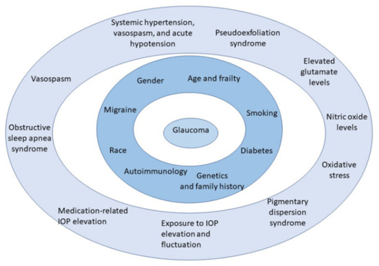 Glaucoma is a multifactorial disease that may be correlated with immune reaction, ischemia, and oxidative stress [6,7,8,9,10,11]. The most important risk factors of disease development are shown in Figure 1 [2,12,13,14,15,16].