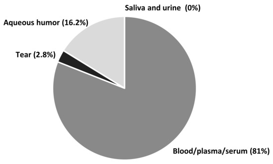 In relation to the studies presented in this manuscript, most biomarkers were analyzed from blood (serum/plasma) samples. Interestingly, the next biological material used in the analyzed studies was the aqueous humor, although its collection is both difficult and invasive. There were only a few biomarker studies using tears or urine—materials relatively easy to collect. No research was found that tracked protein-biomarkers in saliva (Figure 2).