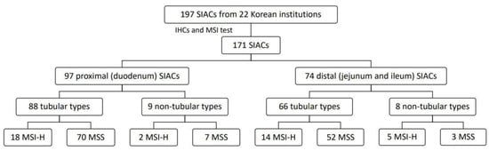 Flow chart of study population and tumor characteristics. SIAC, small intestinal adenocarcinoma; IHC, immunohistochemistry; MSI, microsatellite instability—high; MSS, microsatellite stable.