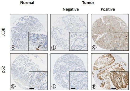- Niklaus, M.; Adams, O.; Berezowska, S.; Zlobec, I.; Graber, F.; Slotta-Huspenina, J.; Nitsche, U.; Rosenberg, R.; Tschan, M.P.; Langer, R. Expression analysis of LC3B and p62 indicates intact activated autophagy is associated with an unfavorable prognosis in colon cancer. Oncotarget 2017, 8, 54604–54615. [Google Scholar] [CrossRef] [PubMed]