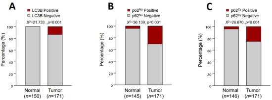 Representative immunohistochemical images of LC3B and p62 are shown in Figure 2. LC3B showed a cytoplasmic punctate expression pattern. Meanwhile, p62 was expressed in both the nucleus (p62Nu) and cytoplasm (p62Cy) with or without a punctate pattern. All non-neoplastic mucosae of the small intestine were negative for LC3B, and 95.9% of them were negative for p62 (Figure 3). Of the 171 SIACs, positive LC3B (LC3B+) expression was observed in 23 patients (13.5%), whereas p62Cy+ and p62Nu+ expression was noted in 43 (25.1%) and 52 (30.4%) cases, respectively. LC3B+, p62Nu+, and p62Cy+ expression was significantly higher in SIACs than in normal mucosae of the small intestine (χ2 test; all p < 0.001) (Figure 3).