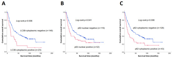 The Kaplan–Meier OS analysis of patients with SIAC. Patients with LC3B+ (A), p62Nu+ (B), and p62Cy+ (C) expression showed poor OS compared to patients with negative expression for each of these proteins (log rank p = 0.006, 0.041, and 0.001, respectively).
