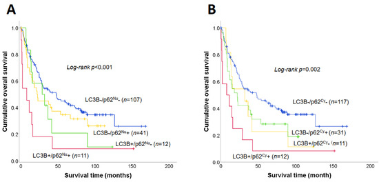 The median survival time of patients with SIAC with LC3B+ expression (14.7 months) was shorter than that of patients with LC3B− (38.5 months; p = 0.006, log-rank test) (Figure 4A). Patients with each p62Nu+ (median survival, 17.8 months) and p62Cy+ (15.1 months) expression had notably shorter survival times than patients with p62Nu− (39.7 months; p = 0.041) and p62Cy− (41.6 months; p = 0.006) expression, respectively (Figure 4B,C). The survival differences were compared between patients with different combinations of expression patterns of the autophagy markers (Figure 5). The median survival times of patients with LC3B+/p62Nu+ (n = 11), LC3B+/p62Nu− (n = 12), LC3B−/p62Nu+ (n = 41), and LC3B−/p62Nu− (n = 107) expression were 7.9, 22.0, 28.8, and 48.1 months, respectively. There was a significant survival difference among the four groups (p < 0.001, log-rank test, overall comparison) (Figure 5A). Patients with LC3B+/p62Cy+ expression (n = 12) also had shorter median survival times (7.9 months) than those with LC3B+/p62Cy− (n = 11; 32.0 months), LC3B−/p62Cy+ (n = 31; 22.0 months), and LC3B−/p62Cy− (n = 117; 48.1 months) expression (p = 0.002, overall comparison) (Figure 5B).